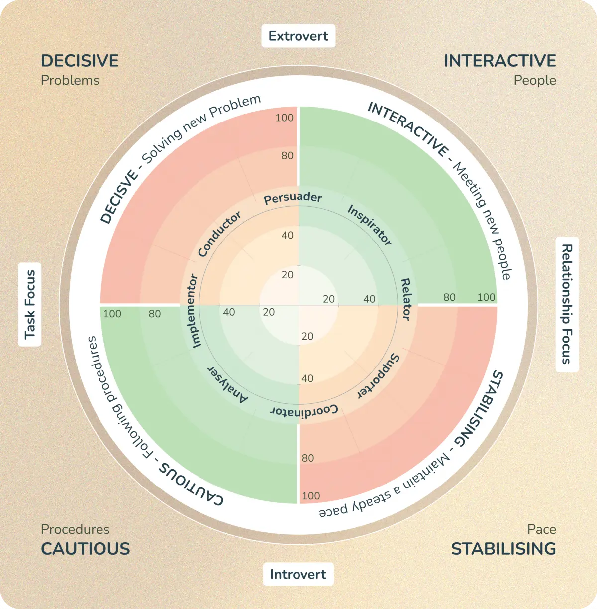 DISCOVER Behaviour laat zien hoe mensen zich van nature gedragen – en hoe zij hun stijl aanpassen aan hun rol, team en omgeving. Het geeft een gestructureerd beeld van hoe iemand omgaat met problemen, mensen, verandering en regels, zowel in hun natuurlijke stijl als in hun aangepaste (on-the-job) stijl.